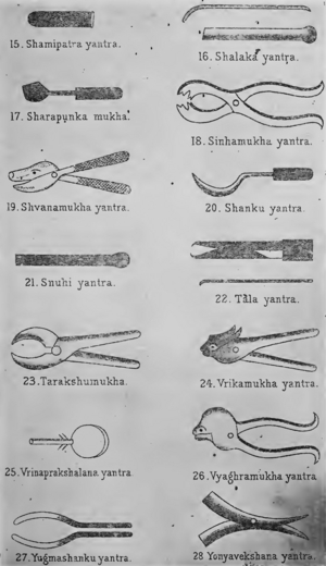 The Yava Vaktra Salaka mentioned above was one of the instruments developed by Sushruta to perform cataract removal. A list of various instruments and how they looked, which was included in Bhishagratna’s translation of the Sushruta Samhita, is reproduced below: